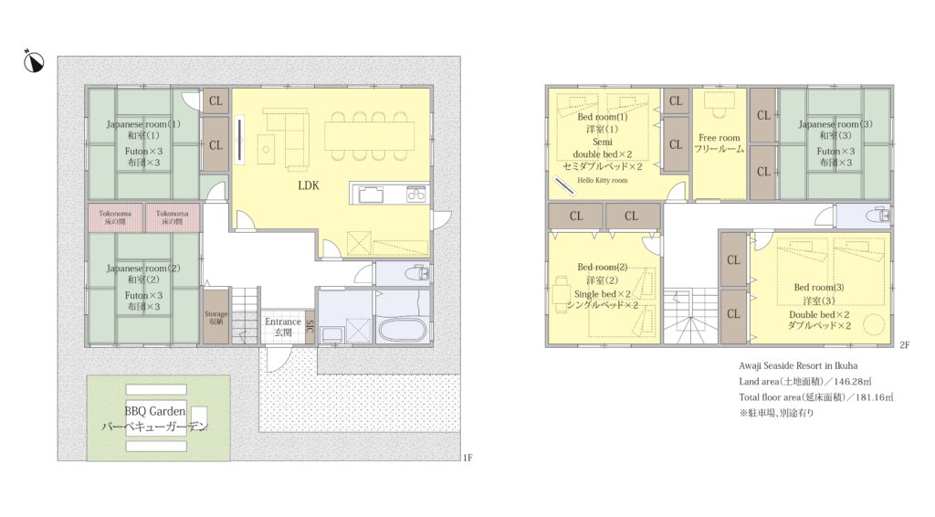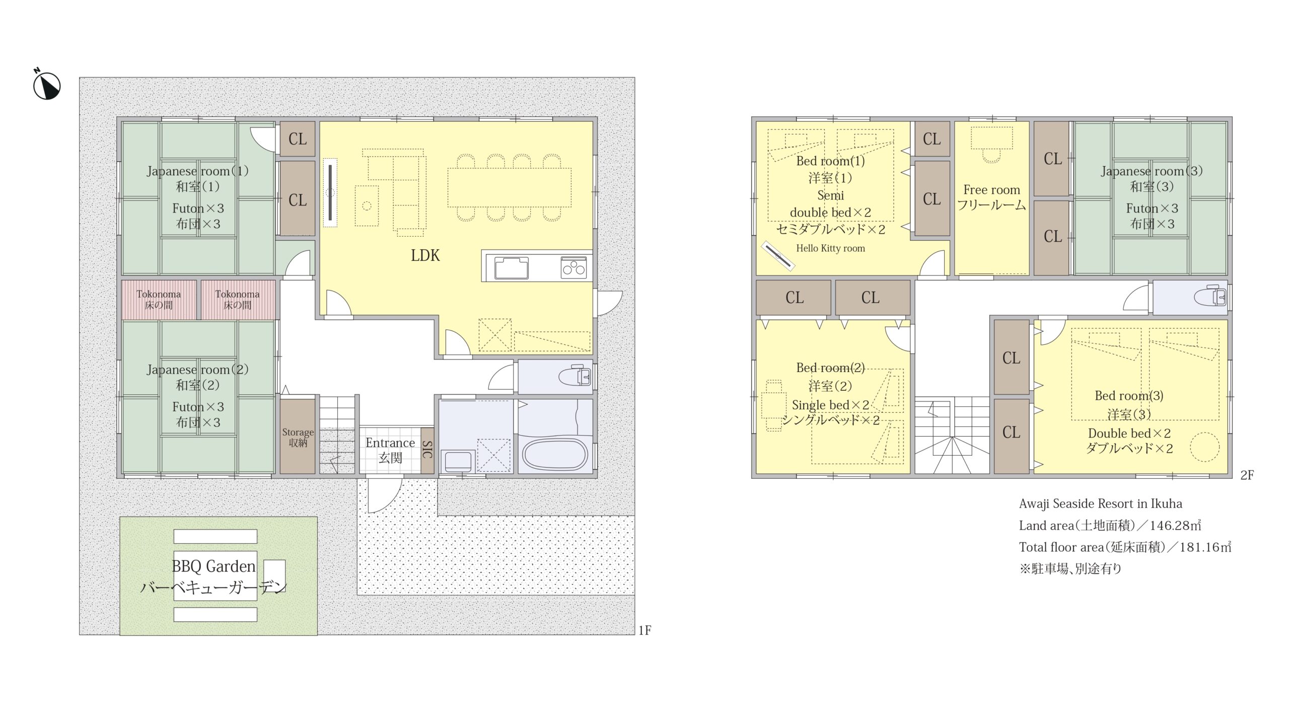 - ベッドルーム:ダブルベッド2台 セミダブル2台 シングルベッド2台 折り畳みベッド1台 布団12組 ※洋室3部屋、和室3部屋