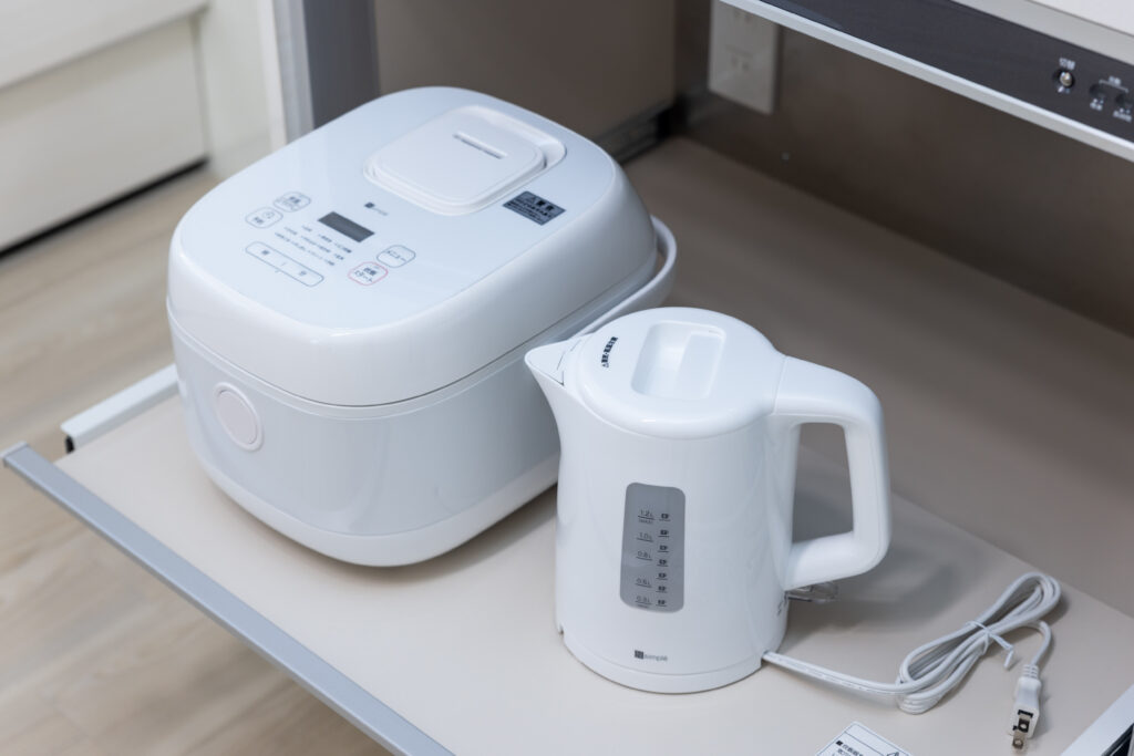 | キッチン | 冷蔵庫、電子レンジ、電気コンロ(3口 グリル-有り)、お鍋、フライパン、包丁、まな板、食器類、グラス、お箸、フォーク、スプーン、ピーラー、菜箸・おたま類、炊飯器、電気ケトル、カセットコンロ、土鍋、子供用食器、スプーン、カップ |